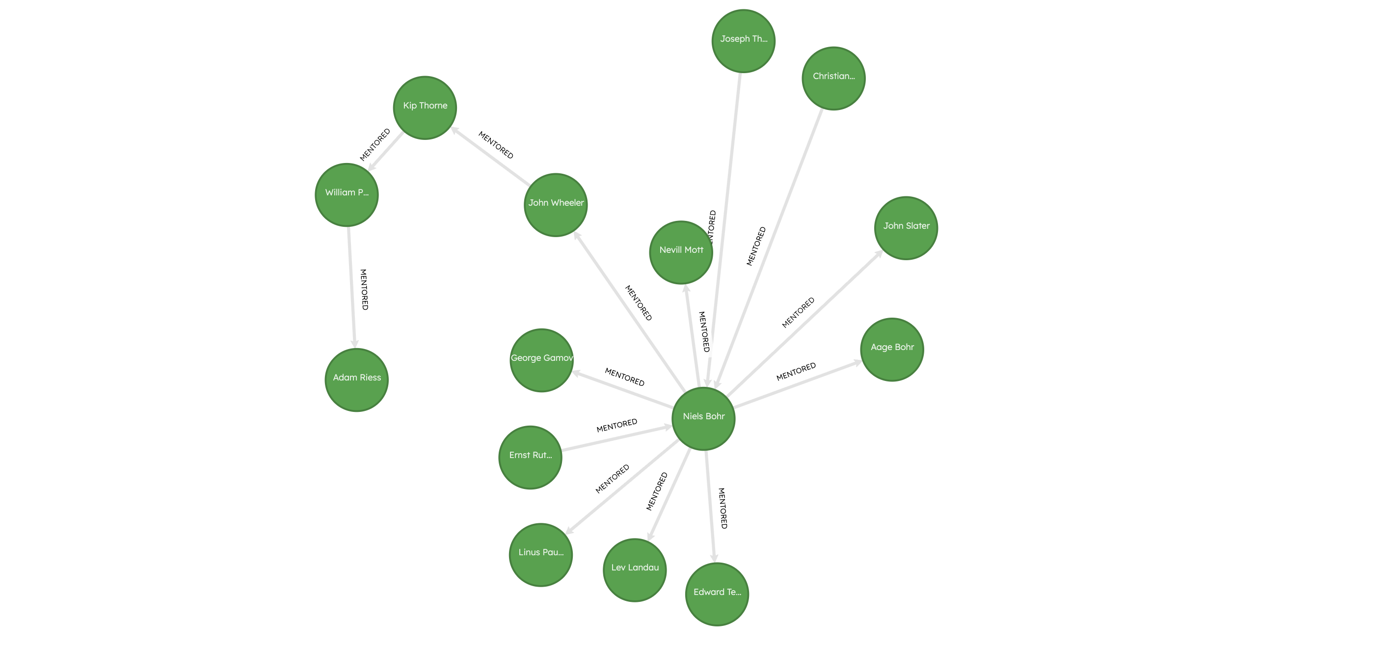 ┌─────────────────┬──────────────────────────┬─────────────┬─────────────┐│ s.name ┆ s.betweenness_centrality ┆ num_mentors ┆ num_mentees ││ --- ┆ --- ┆ --- ┆ --- ││ str ┆ f64 ┆ i64 ┆ i64 │╞═════════════════╪══════════════════════════╪═════════════╪═════════════╡│ Joseph Thomson ┆ 0.00254 ┆ 1 ┆ 11 ││ Max Born ┆ 0.002367 ┆ 1 ┆ 8 ││ Niels Bohr ┆ 0.00179 ┆ 2 ┆ 10 ││ Robert Millikan ┆ 0.00082 ┆ 2 ┆ 2 ││ Wolfgang Pauli ┆ 0.000654 ┆ 2 ┆ 1 │└─────────────────┴──────────────────────────┴─────────────┴─────────────┘Conclusions