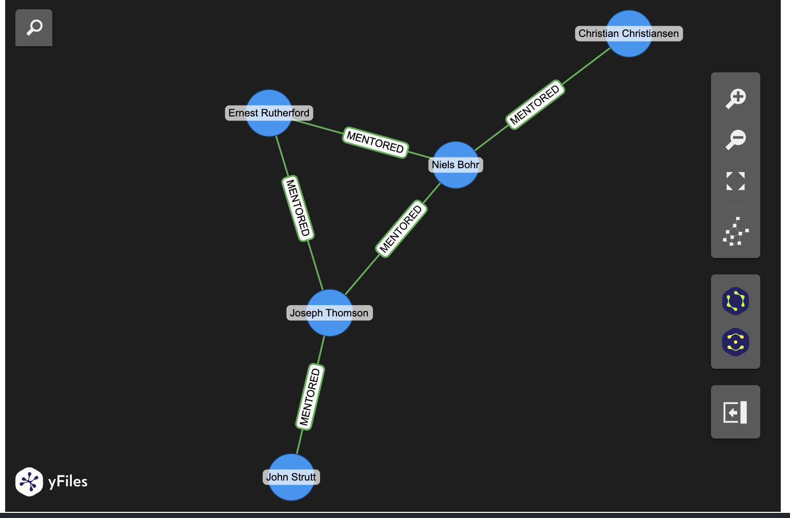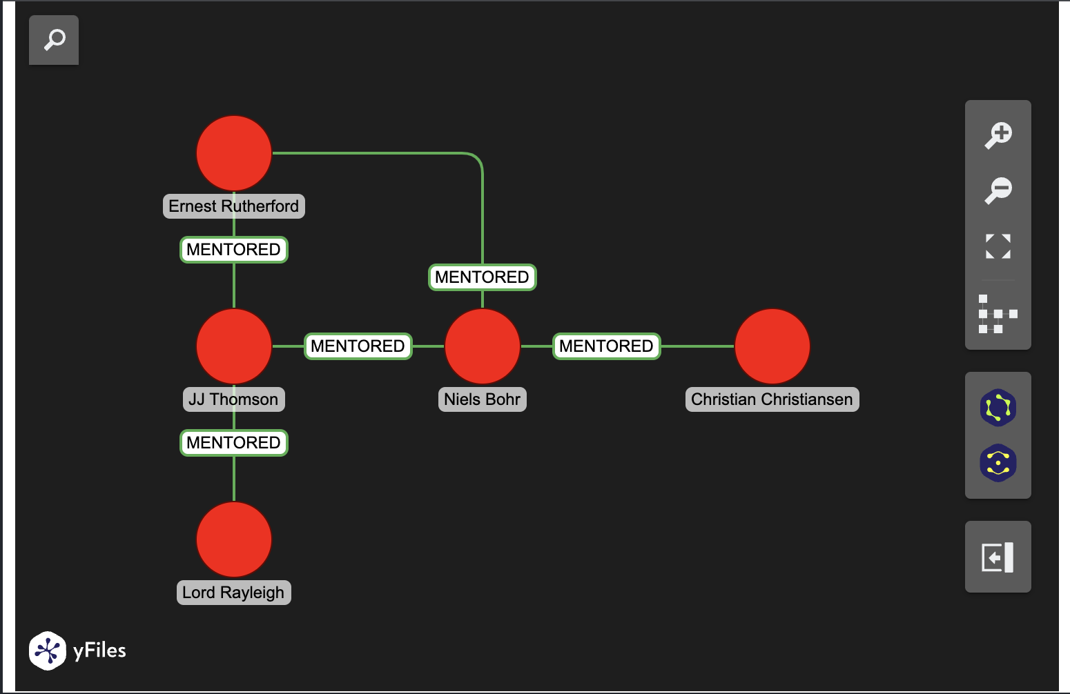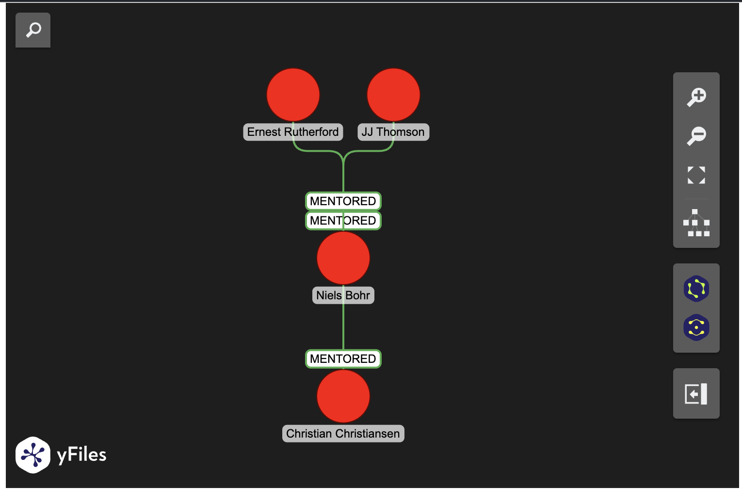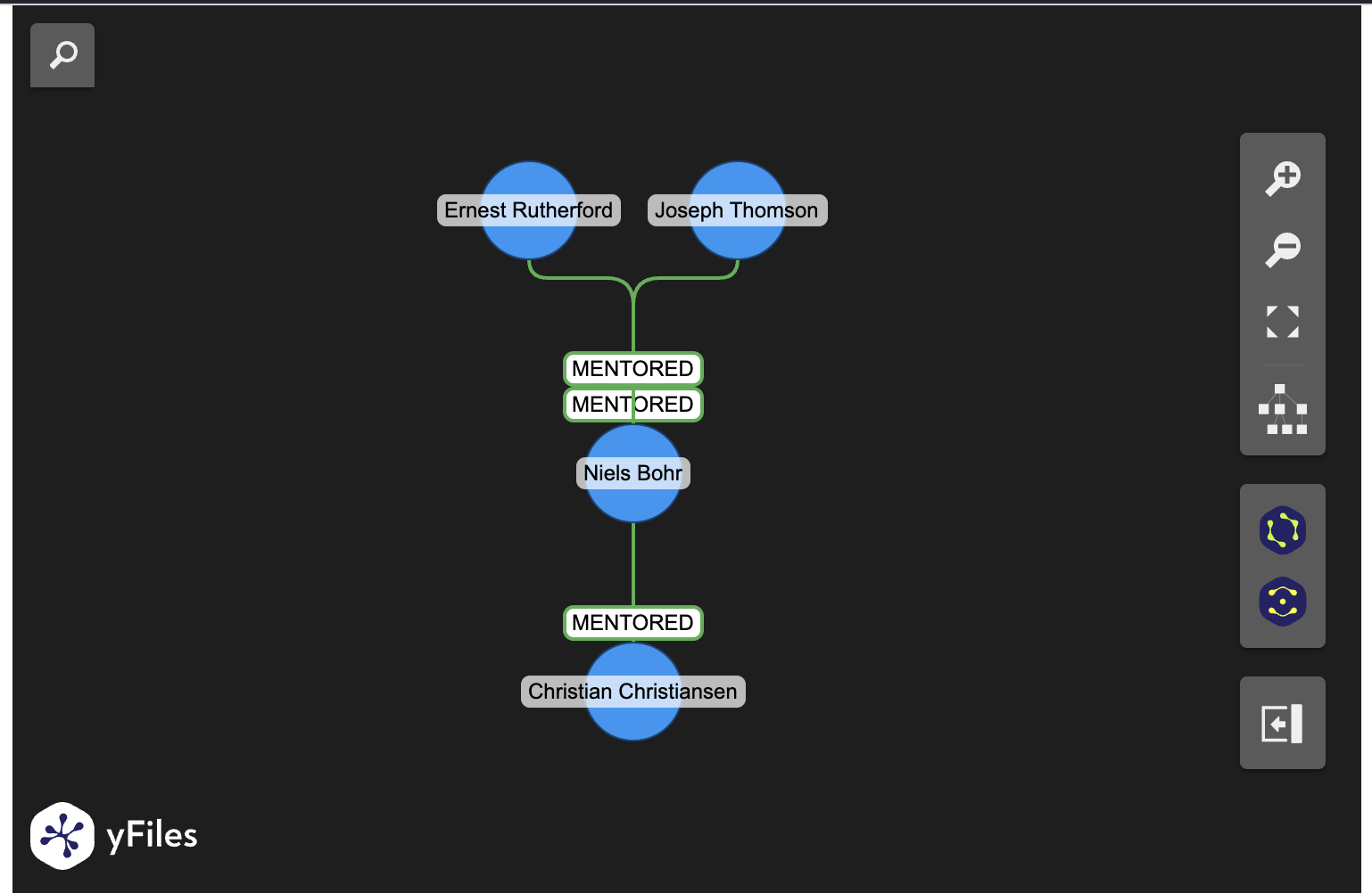 In this case, because the relationships result in a tree structure, it can be useful to specify the tree layout while initializing the widget. The query being run here is asking the question “Who are the mentors of Christian Christiansen up to 2 degrees?”.